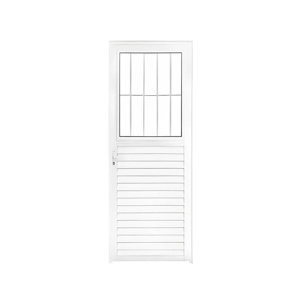 Esta é uma porta mista que é composta por palhetas de alumínio e vidro “abre e fecha”. A parte de vidro abre para proporcionar maior ventilação, porém a mesma possui grade para garantir a sua segurança mesmo quando o vidro estiver aberto.